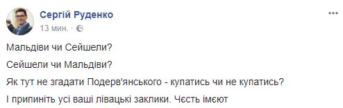 Журналист Сергей Руденко цитирует известного украинского писателя: "Мальдивы или Сейшелы? Сейшелы или Мальдивы? Как тут не вспомнить Подервянского - купаться или не купаться? И прекратите все ваши левацкие призывы".