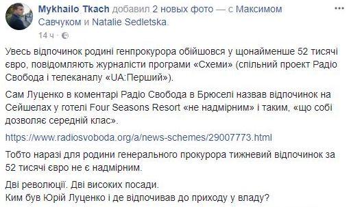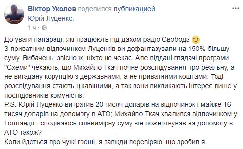 "Вниманию папарацци, которые работают под крышей радио Свобода. С частным отдыхом Луценко вы дофантазировали на 150% большую сумму. Извинений, конечно же, никто не ждет. Но преданные зрители программы "Схемы" ожидают, что Михаил Ткач начнет расследование о реальной, а не вымышленной коррупции с государственными, а не частными средствами. Тогда расследования становятся интереснее, а так они вызывают интерес только у последователей коммунистов.