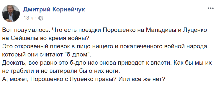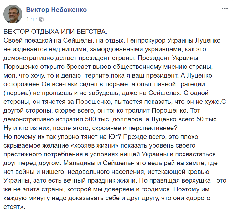 "Вот подумалось. Что есть поездки Порошенко на Мальдивы и Луценко на Сейшелы во время войны?