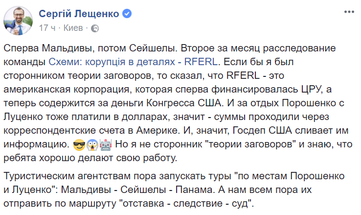 "Туристическим агентствам пора запускать туры "по местам Порошенко и Луценко": Мальдивы - Сейшелы - Панама. А нам всем пора их отправить по маршруту "отставка - следствие - суд"", - написал в Facebook нардеп от Блока Порошенко Сергей Лещенко.