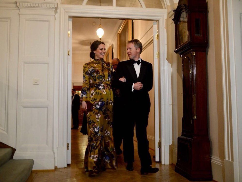 Для вечера Кейт Миддлтон выбрала макси платье из шелка горчичного цвета от бренда Erdem. Наряд украшен крупным цветочным принтом, оборками на рукавах и подоле платья, и бантом. Цена платья 1400 долларов.