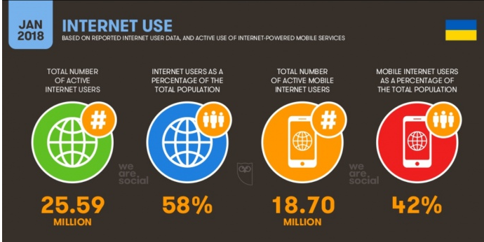 25,59 миллиона украинцев пользуются интернет-сетью, что составляет 58% населения страны.