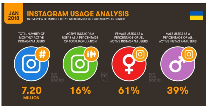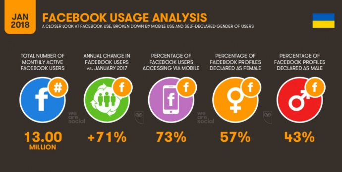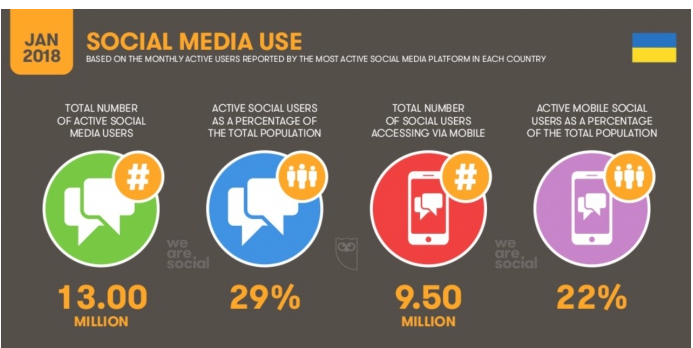 С января 2017 по январь 2018 количество интернет пользователей в Украине увеличилось на 17% (4 миллиона человек). В то же время, количество пользователей соцсетей уменьшилась на 24%, что также составляет 4 миллиона человек.