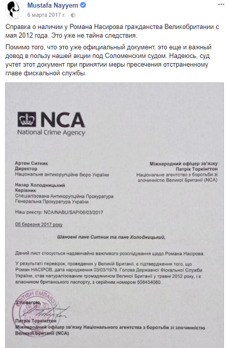 Еще в марте 2017 года депутат БПП Мустафа Найем опубликовал справку, свидетельствующую о том, что у отстраненного председателя ГФС есть гражданство Великобритании.
