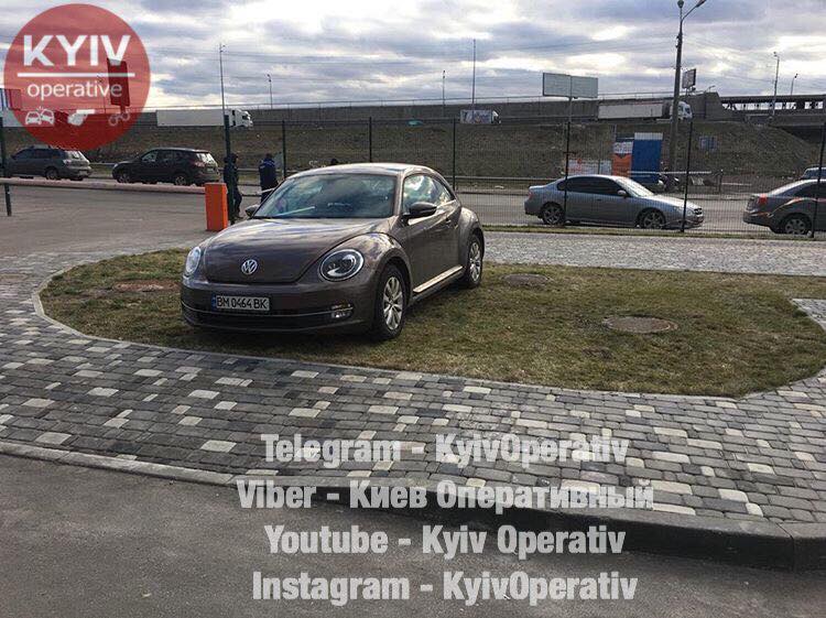 Сегодня в Киеве у метро "Славутич" (Дарницкий район) женщина-водитель поставила свою иномарку прямо на зону зеленых насаждений, грубо нарушив правила парковки.