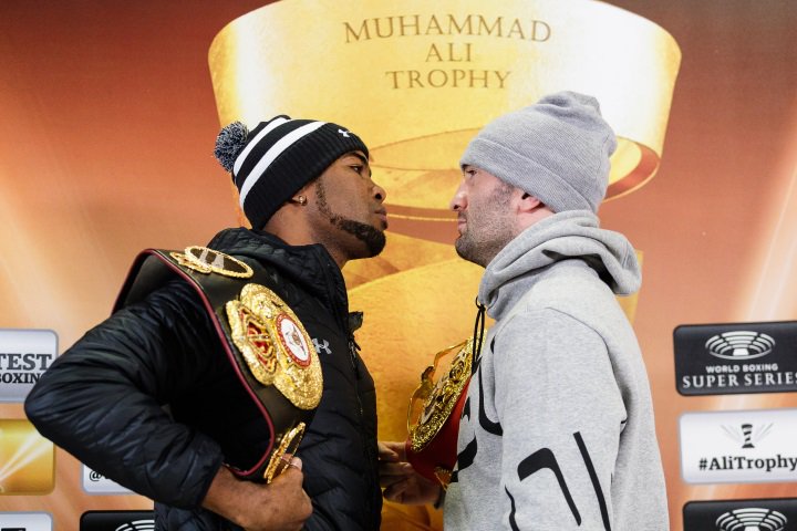 Чемпион мира IBF Мурат Гассиев (25-0, 18 нокаутов) и чемпион мира WBA Юньер Дортикос (22-0, 21 нокаут) на дуэли, фото: boxingscene.com