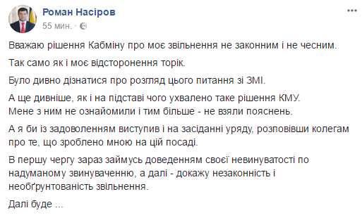 "Считаю решение Кабмина о моем увольнении незаконным и нечестным. Так же, как и мое отстранение в прошлом году. (…) В первую очередь сейчас займусь доказательством своей невиновности по надуманному обвинению, а дальше - докажу незаконность и необоснованность увольнения", - написал Р.Насиров на странице в Facebook в среду.