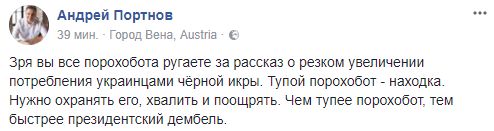 Экс-глава АП Андрей Портнов призывает беречь таких, как Черновол: "Зря вы все порохобота ругаете за рассказ о резком увеличении потребления украинцами черной икры. Тупой порохобот - находка. Нужно охранять его, хвалить и поощрять. Чем тупее порохобот, тем быстрее президентский дембель".