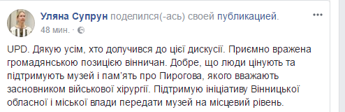 "Спасибо всем, кто присоединился к этой дискуссии. Приятно поражена гражданской позицией винничан. Хорошо, что люди ценят и поддерживают музей и память о Пирогова, которого считают основателем военной хирургии. Поддерживаю инициативу Винницкой областной и городской власти передать музей на местный уровень", - написала она.