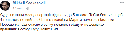 Киевский апелляционный админсуд объявил перерыв в заседании по вопросу депортации лидера "Руха новых сил" Михаила Саакашвили и продолжит рассмотрение дела 5 февраля. Начало заседания назначено в 10:00.