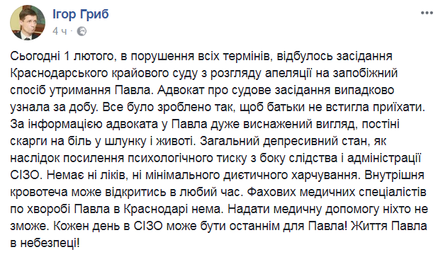 "У Павла очень изможденный вид, постоянные жалобы на боль в желудке и животе. Общее депрессивное состояние как следствие усиления психологического давления со стороны следствия и администрации СИЗО. Нет ни лекарств, ни минимального диетического питания. Внутреннее кровотечение может открыться в любое время. Профессиональных медицинских специалистов по болезни Павла в Краснодаре нет. Оказать медицинскую помощь никто не сможет. Каждый день в СИЗО может быть последним для Павла! Жизнь Павла в опасности!" - написал Игорь Гриб.