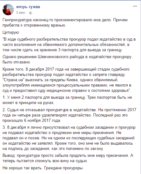 "Генпрокуратура прибегла к откровенному вранью", - написал Гужва на странице в Facebook.