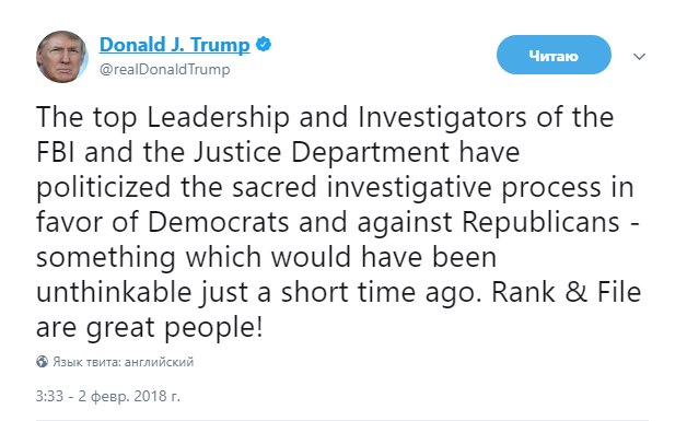 "Высшее руководство и следователи ФБР и министерства юстиции политизировали священный следственный процесс в пользу демократов и против республиканцев - это было немыслимо еще совсем недавно", - заявил Трамп.