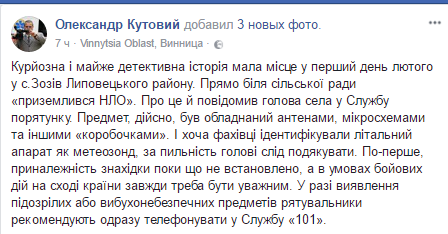 "Курьезная и почти детективная история имела место в первый день февраля в с.Зозив Липовецкого района. Прямо у сельского совета "приземлился НЛО". Об этом сообщил председатель села в Службу спасения. Предмет, действительно, был оборудован антеннами, микросхемами и прочими "коробочками", - написал Кутовой.