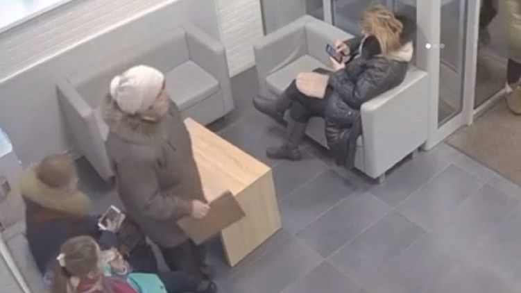 На записи видно, как пожилая гражданка какое-то время сидит в очереди, после чего в присутствии других людей спокойно берет с соседнего дивана планшет iPad и сразу же уходит.