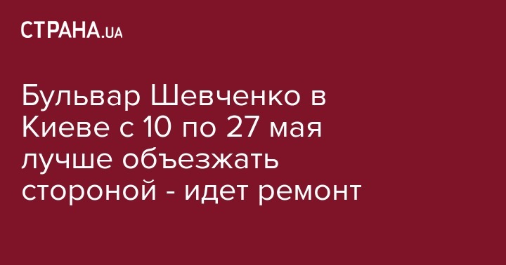 Киевская городская государственная администрация предупреждает горожан и гостей столицы об ограничении движения автотранспорта в центре города на бульваре Тараса Шевченко  в период с 10 по 27 мая в связи с продолжением ремонта дорожного покрытия. Соответствующее сообщение сегодня появилось на ее официальном сайте