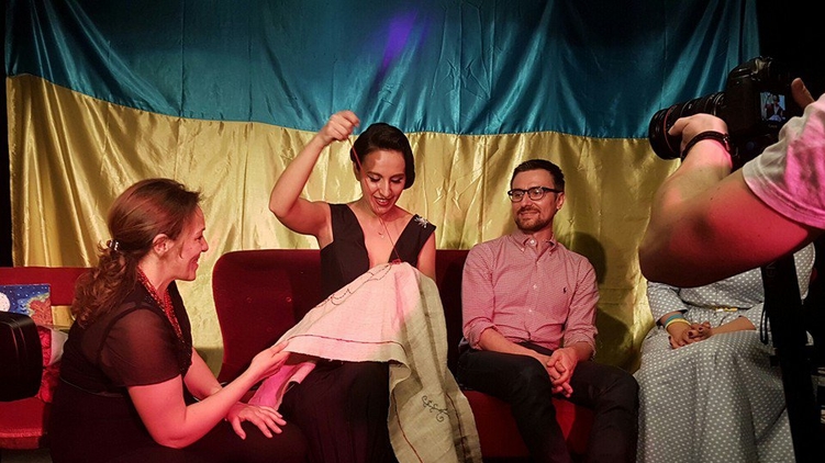 Певица вышила несколько узоров на подаренном ей рушнике, после чего сфотографировалась с поклонниками. Фаны украинской певицы вручили ей еще один презент - книгу "Один год в Стокгольме".