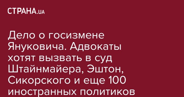 Адвокаты экс-президента Виктора Януковича намерены допросить в суде по делу о госизмене иностранных дипломатов: экс-глав МИД Германии, Польши и Франции Франка-Вальтера Штайнмайера, Радослава Сикорского и Лорана Фабиуса. А также бывшего верховного представителя ЕС по вопросам внешней политики и безопасности Кэтрин Эштон и других представителей международной политики.