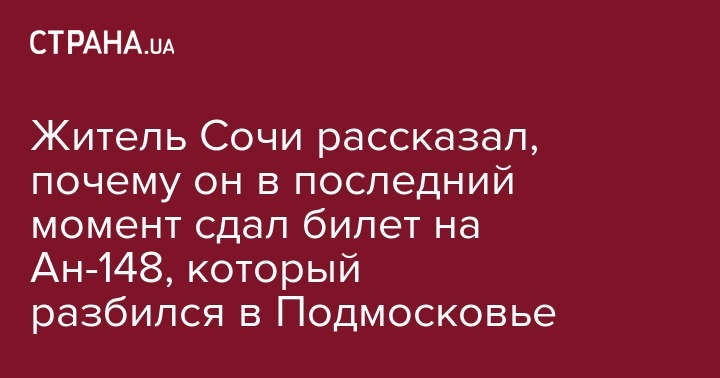 Житель Сочи Максим Коломейцев, который собирался лететь из Москвы в Орск на разбившемся в Подмосковье самолете Ан-148, за несколько дней до рейса неожиданно передумал лететь этим рейсом и сдал билеты.