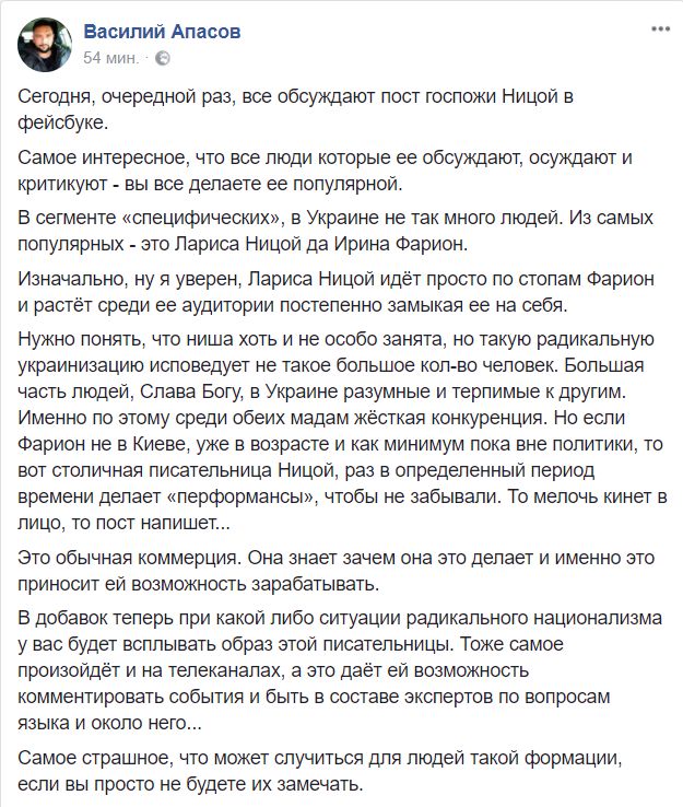 С ним согласен телеведущий Василий Апасов, который пишет: "Сегодня, очередной раз, все обсуждают пост госпожи Ницой в фейсбуке. Самое интересное, что все люди которые ее обсуждают, осуждают и критикуют – вы все делаете ее популярной.