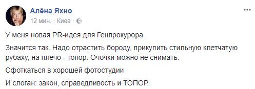 Журналист Алена Яхно: "У меня новая PR-идея для Генпрокурора. Значится так. Надо отрастить бороду, прикупить стильную клетчатую рубаху, на плечо – топор. Очочки можно не снимать.
