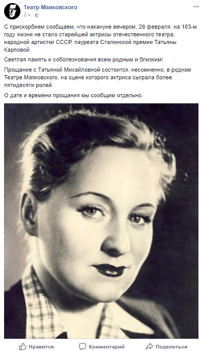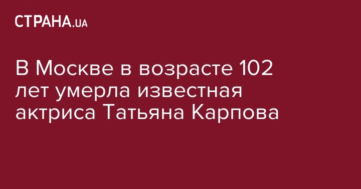"С прискорбием сообщаем, что на 103-м году жизни не стало легендарной актрисы, народной артистки СССР Татьяны Карповой", – говорится в сообщении.