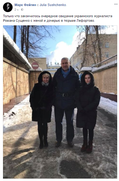 "Только что закончилось очередное свидание украинского журналиста Романа Сущенко с женой и дочерью в тюрьме Лефортово", - написал Фейгин.
