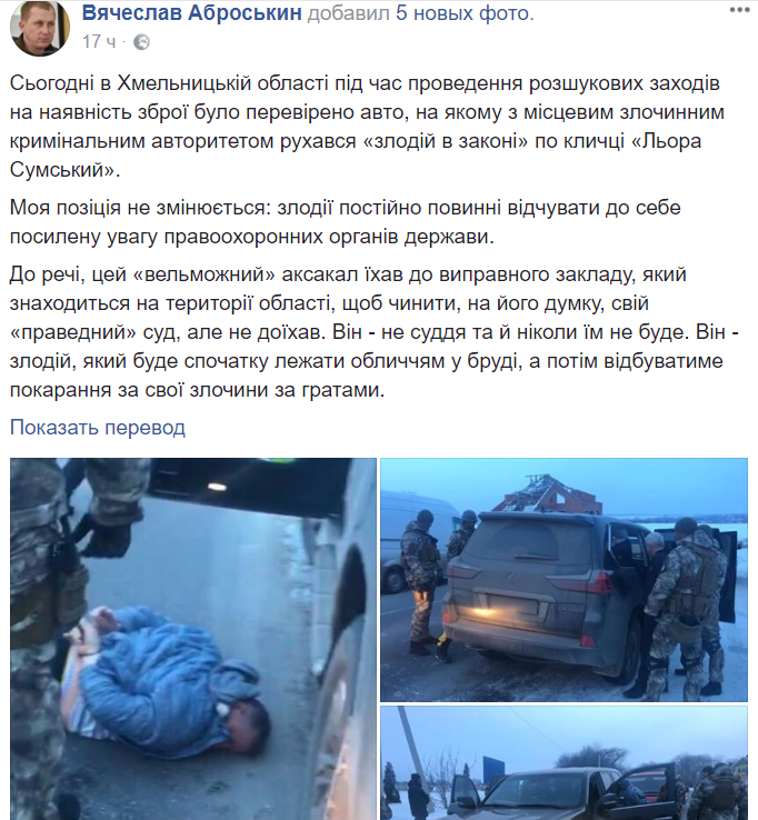 Вчера заместитель главы Нацполиции Украины Вячеслав Аброськин сообщил на своей страничке в Facebook о задержании в Хмельницкой области известного вора в законе Сергея Лысенко по прозвищу Лера Сумской. По словам Аброськина, авторитет направлялся в одну из колоний области "вершить суд".