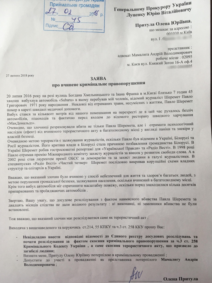 Луценко просят безотлагательно внести соответствующие сведения в ЕРДР и начать расследование по факту совершения уголовного преступления по ч.3 ст. 258 УК, а именно совершение террористического акта, который привел к гибели человека.