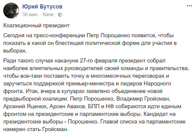 Так, журналист Юрий Бутусов считает, что гарант может объявить, что идет на второй срок президенства. Причем блоком с "Народным фронтом" и премьером Владимиром Гройсманом.