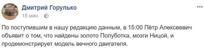 "По поступившим в нашу редакцию данным, в 15:00 Пётр Алексеевич объявит о том, что найдены золото Полуботка, мозги Ницой, и продемонстрирует модель вечного двигателя", - пишет журналист Дмитрий Горулько.