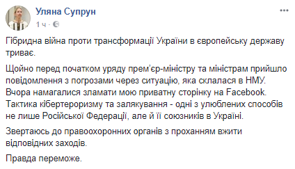 Также Супрун напомнила, что вчера пытались сломать ее частную страницу в Facebook.