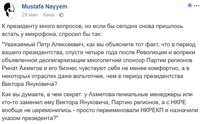 "Уважаемый Петр Алексеевич, как вы объясните тот факт, что в период вашего президентства, спустя четыре года после Революции и вопреки объявленной деолигархизации многолетний спонсор Партии регионов Ринат Ахметов и его бизнес чувствуют себя не менее комфортно, а в некоторых отраслях даже вольготнее, чем в период президентства Виктора Януковича?