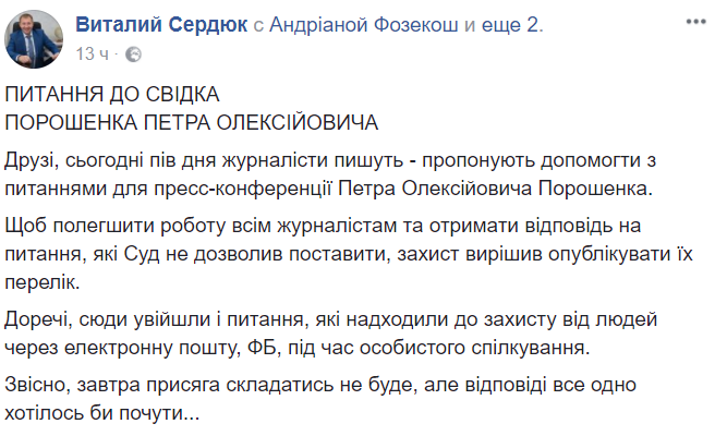 Адвокат Виктора Януковича Виталий Сердюк перед пресс-конференицией опубликовал длинный список из 136 вопросов к Порошенко, которые он не смог задать во время допроса на суде по госизмене Януковича.