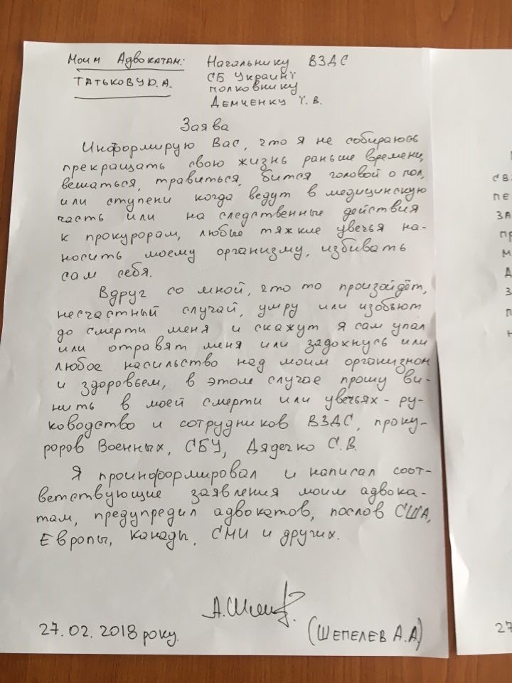 В заявлениях он говорит о том, что не планирует суицид и указывает, что в его смерти нужно будет винить военных прокуроров, СБУ, руководство СИЗО, а также украинского бизнесмена Сергея дядечко. Также он утверждает, что 26 февраля у него в камере состоялся обыск и был изъят его дневник с записями лекарств.