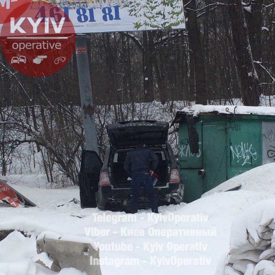 В Киеве Range Rove взлетел на заснеженной дороге и ударился в билборд