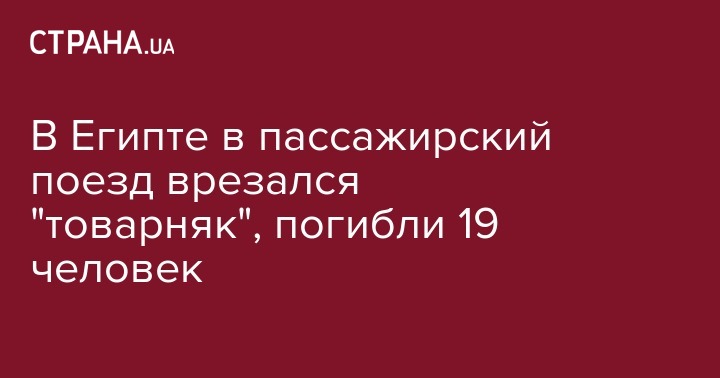 В египетской провинции Бохейра столкнулись два поезда, в результате чего погибли по меньшей мере 19 человек. Еще 38 человек числятся на данный момент пострадавшими.