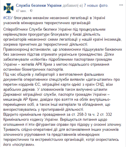 СБУ раскрыла организацию, которая легализовывала в Украине иностранцев, в том числе и участников международных террористических организаций. Об этом сообщается на странице СБУ в Facebook.