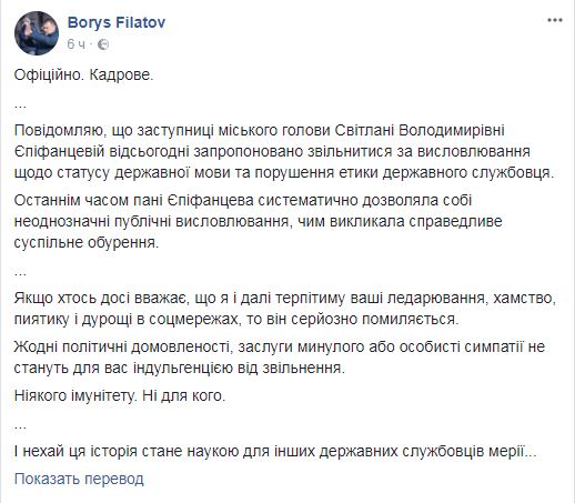 Что касается украинского языка, то Филатов имеет в виду недавнее заявление Епифанцевой в Facebook Епифанцевой о том, что кинотеатр "Мост Кино" жители Днепра перестали ходить из-за того, что там в показе остались фильмы только на украинском языке.