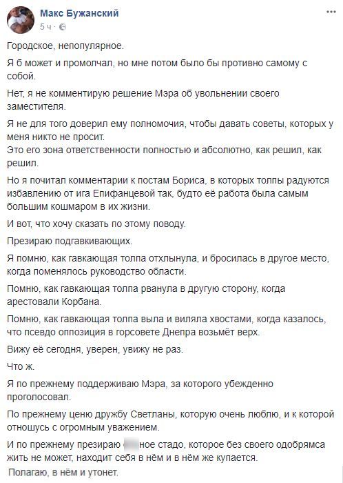 Но я почитал комментарии к постам Бориса, в которых толпы радуются избавлению от ига Епифанцевой так, будто ее работа была самым большим кошмаром в их жизни. И вот что хочу сказать по этому поводу. Презираю подгавкивающих. Я помню, как гавкающая толпа отхлынула, и бросилась в другое место, когда поменялось руководство области. Помню, как гавкающая толпа рванула в другую сторону, когда арестовали Корбана. Помню, как гавкающая толпа выла и виляла хвостами, когда казалось, что псевдо-оппозиция в горсовете Днепра возьмет верх. Вижу ее сегодня, уверен, увижу не раз.