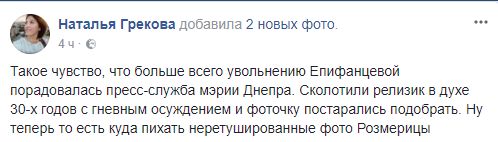 Журналист Наталья Грекова: "Такое чувство, что больше всего увольнению Епифанцевой порадовалась пресс-служба мэрии Днепра. Сколотили релизик в духе 30-х годов с гневным осуждением и фоточку постарались подобрать".
