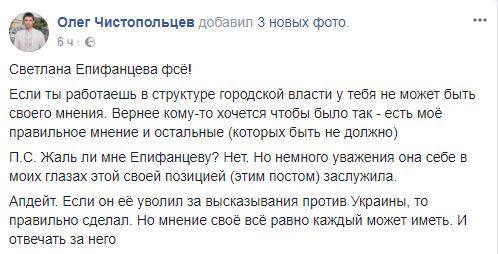 Позже Епифанцева в Facebook заявила, что между должностью и свободой мнения выбирает свободу мнения.