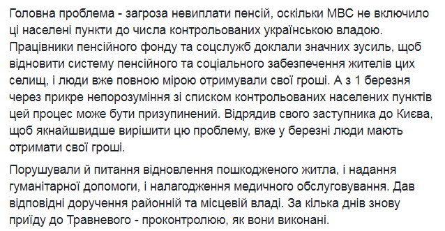 Работники пенсионного фонда и социальных служб приложили значительные усилия, чтобы возобновить систему пенсионного и социального обеспечения жителей этих поселков, и люди уже в полной мере получали свои деньги. А с 1 марта из-за досадного недоразумения со списком контролируемых населенных пунктов этот процесс может быть приостановлен.