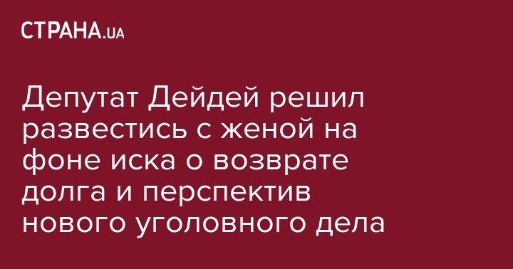 26 февраля Дейдей подал соответствующий иск о разводе в Печерский суд, заседание состоится 12 марта. При этом бракоразводный процесс сопровождается иском коллеги жены с требованием к супругам вернуть долг в 3,5 млн гривен. Об этом сообщили источники "Страны".