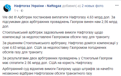 "По решению суда "Газпром" должен возместить "Нафтогазу" ущерб на $4,63 млрд за недопоставку газ в рамках транзитного договора", - говорится в сообщении "Нафтогаза".