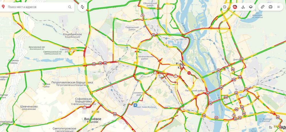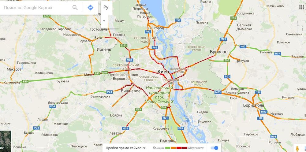 По данным Google maps и сервиса "Яндекс-пробки", парализовано движение транспорта на главных улицах города: проспекте Победы, бульваре Шевченко в обоих направлениях, бульваре Леси Украинки. Стоят автомобили в тянучке на Петропавловской Борщаговке и  Также стоит движение на Северном и Южном мосту. На левом берегу Киева уже ставшие традиционными пробки на Воскресенке и Троещине.