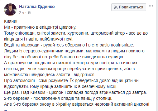 "Киевляне! Мы практически в эпицентре циклона. Поэтому снегопады, снежные заносы, метели, штормовой ветер - все это до конца дня и даже ближайшей ночью", - пишет Диденко.