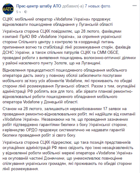 28 февраля специалисты компании "Vodafone Украина" занимались поисками повреждения систем мобильной связи в районе Золотого Луганской области, но еще не выполнено 17 заявок на ремонт в Донецкой области. Напомним, ранее в Минске представители "ДНР" гарантировали безопасность ремонтникам Vodafone