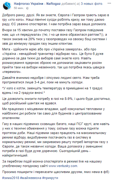 "Цель - осуществить мечту или о том, чтобы "Украина замерзла", или, что "Украина - ненадежный транзитер и отбирает газ". Это было бы очень уместно за две недели до выборов сами знаете кого... Давайте поступим нехорошо и испортим человеку праздник. Нам надо продержаться только 3-4 дня, пока не пройдут холода. У кого есть котлы, уменьшите температуру в помещении на 1 градус днем и на 2 градуса ночью", - говорится в сообщении.