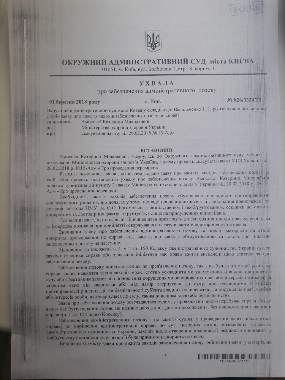 Административный суд Киева восстановил ректора НМУ им. Богомольца Екатерину Амосову в должности.